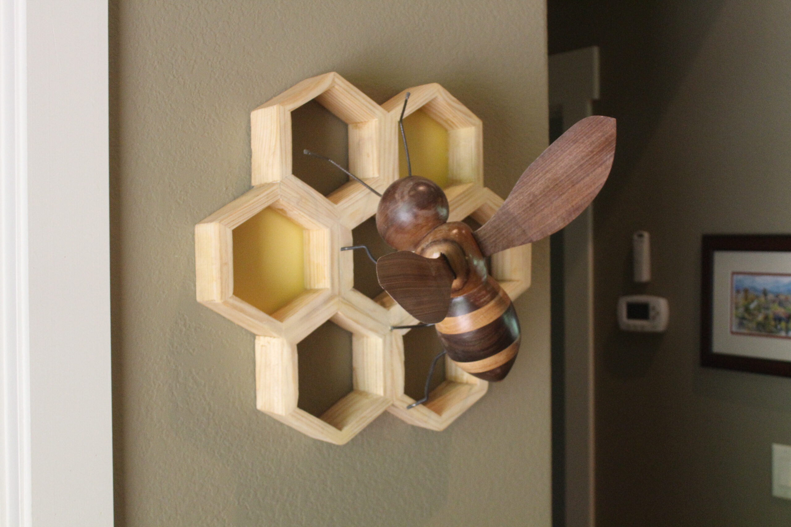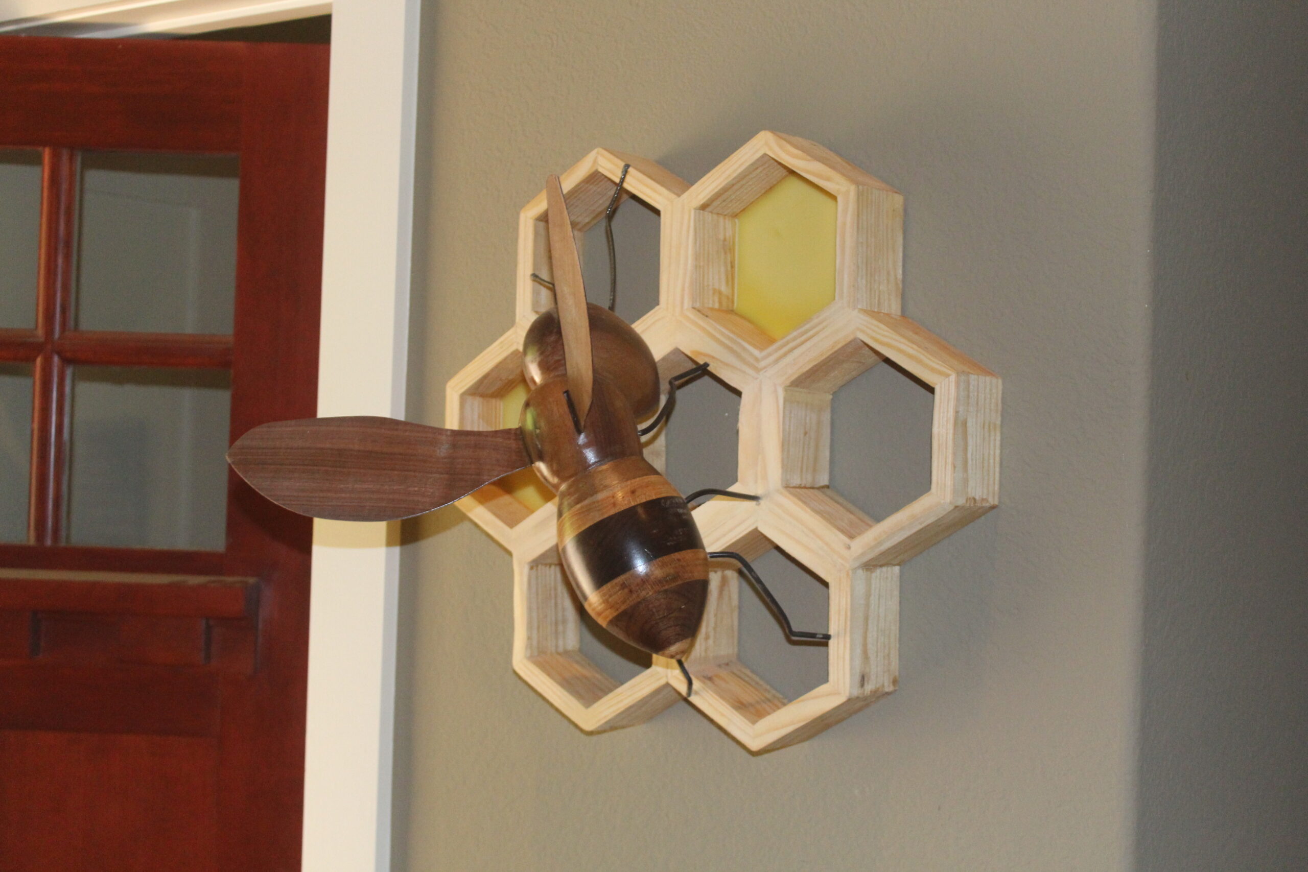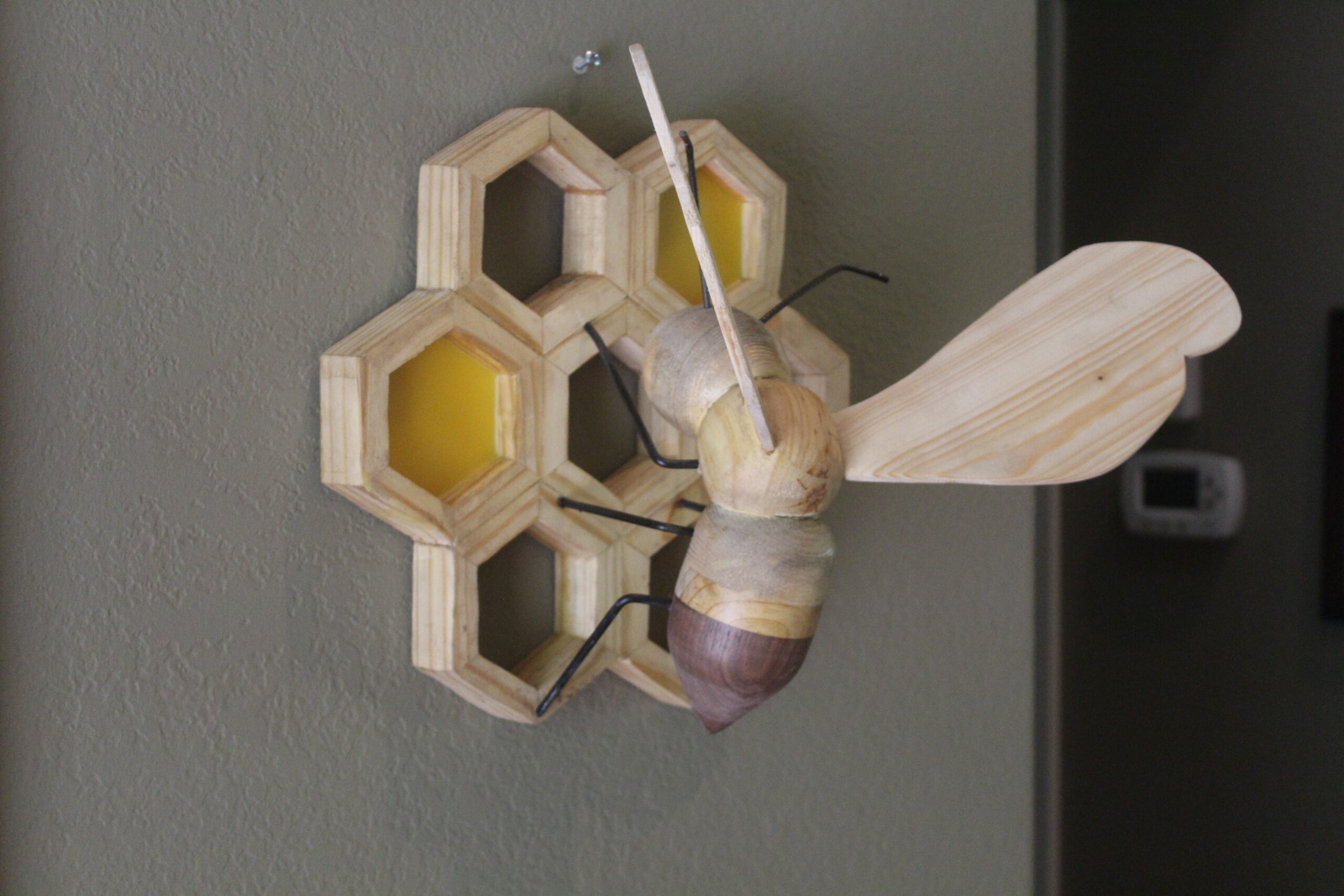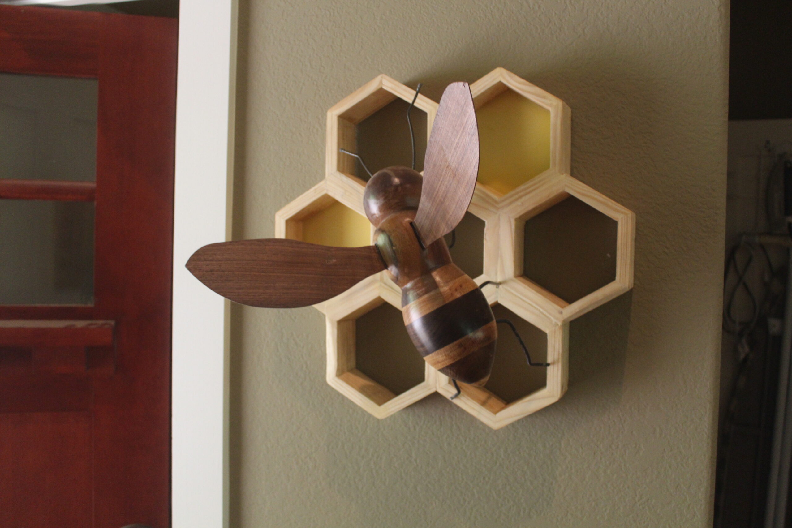 Bee on Honeycomb Made of various woods, a bee on a 7 section honeycomb, measuring apprx 1ft x 18″, extending 10″ from wall. Two section s are filled with actual bees wax. 2 examples shown, one with black walnut wings and one with pine wings. category Portfolio date June 11, 2022