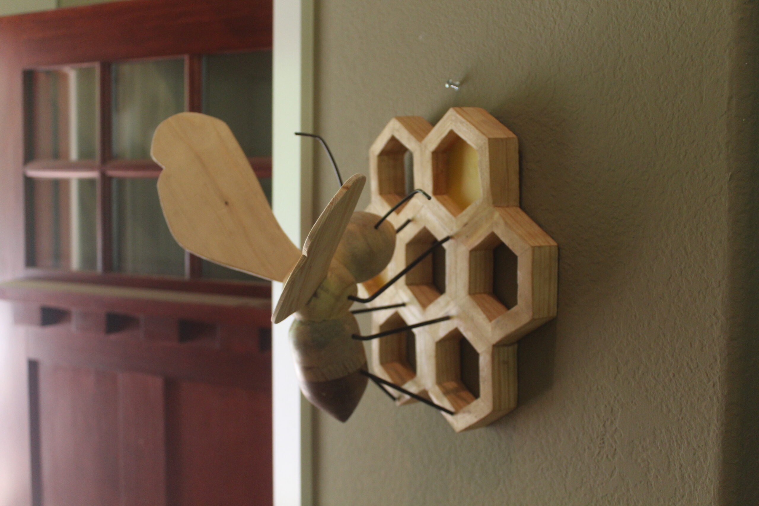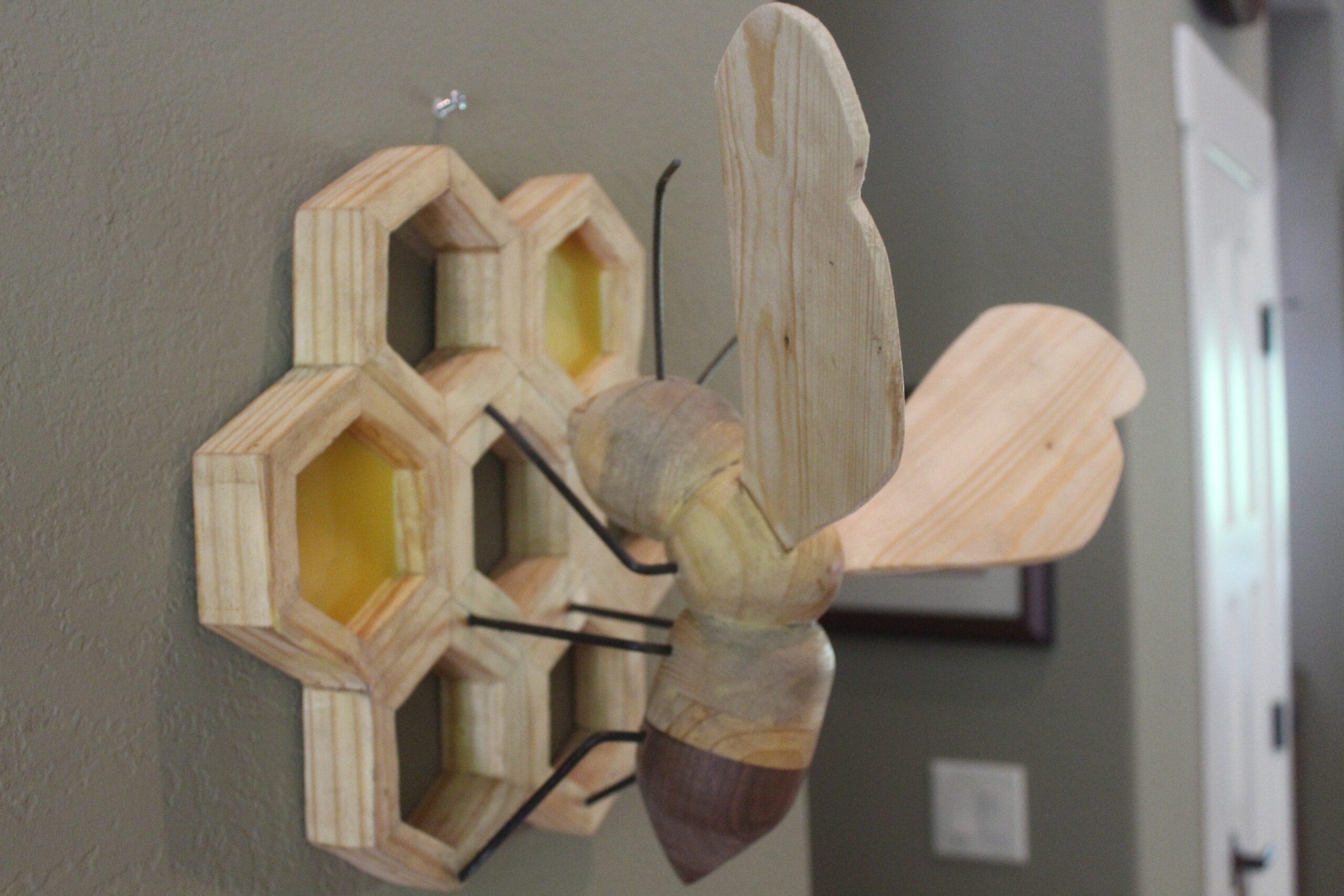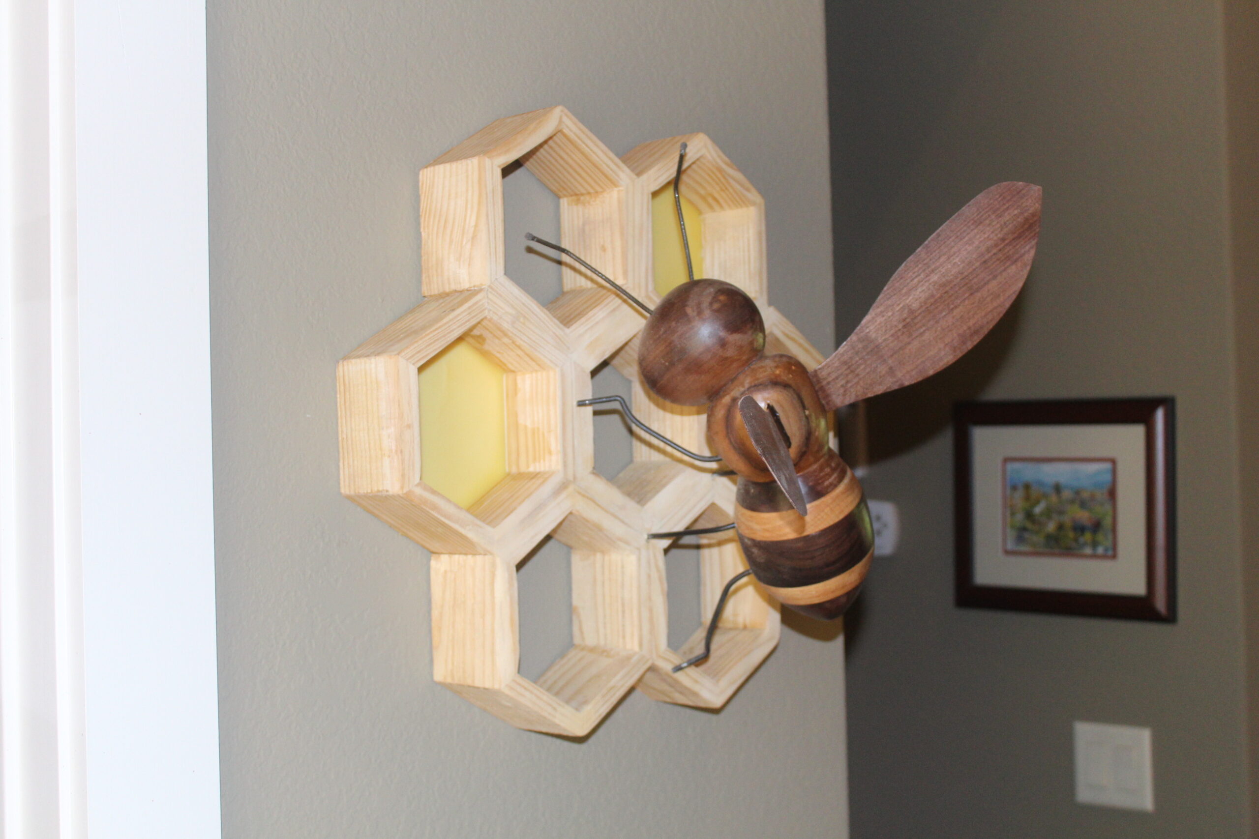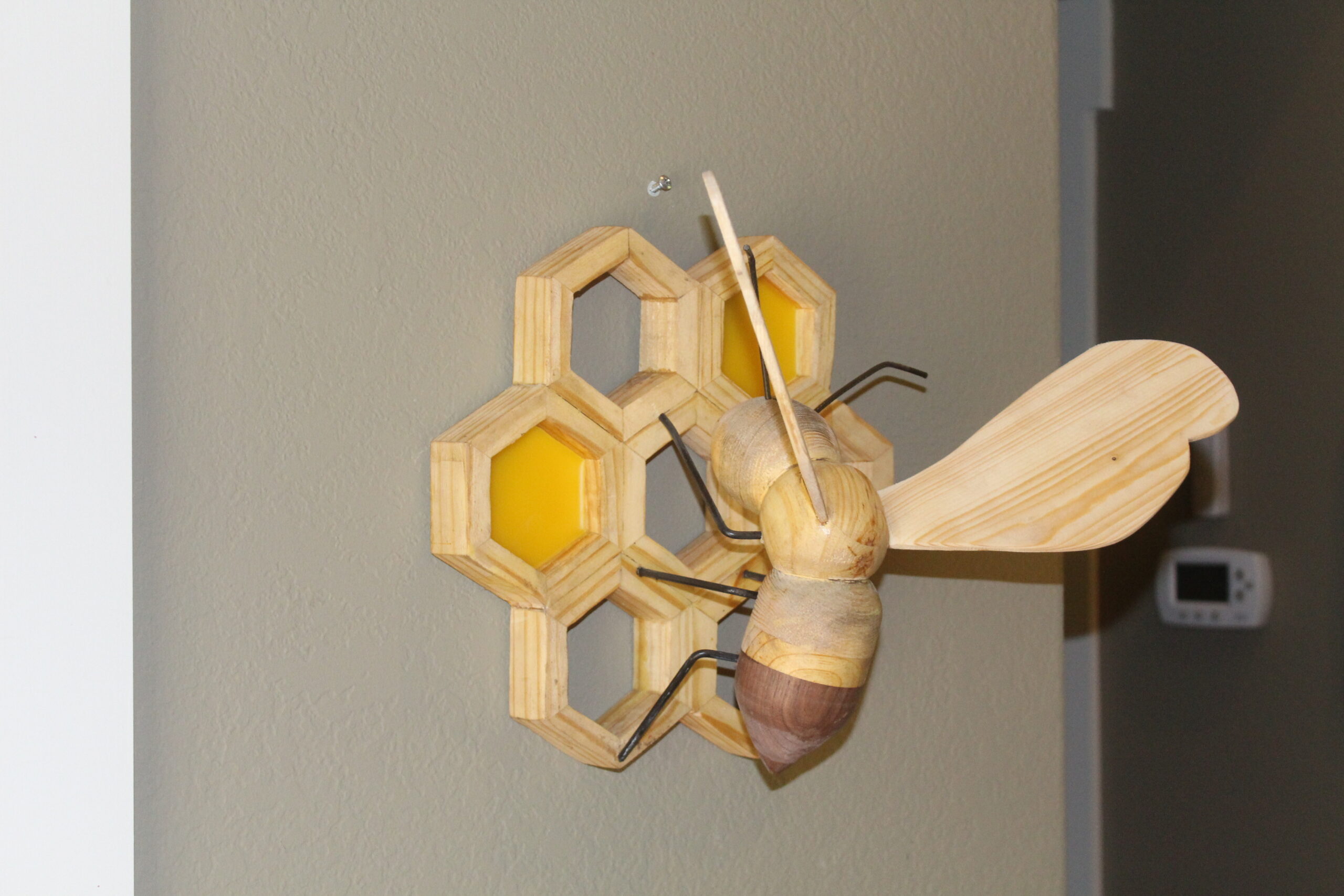 Bee on Honeycomb Made of various woods, a bee on a 7 section honeycomb, measuring apprx 1ft x 18″, extending 10″ from wall. Two section s are filled with actual bees wax. 2 examples shown, one with black walnut wings and one with pine wings. category Portfolio date June 11, 2022