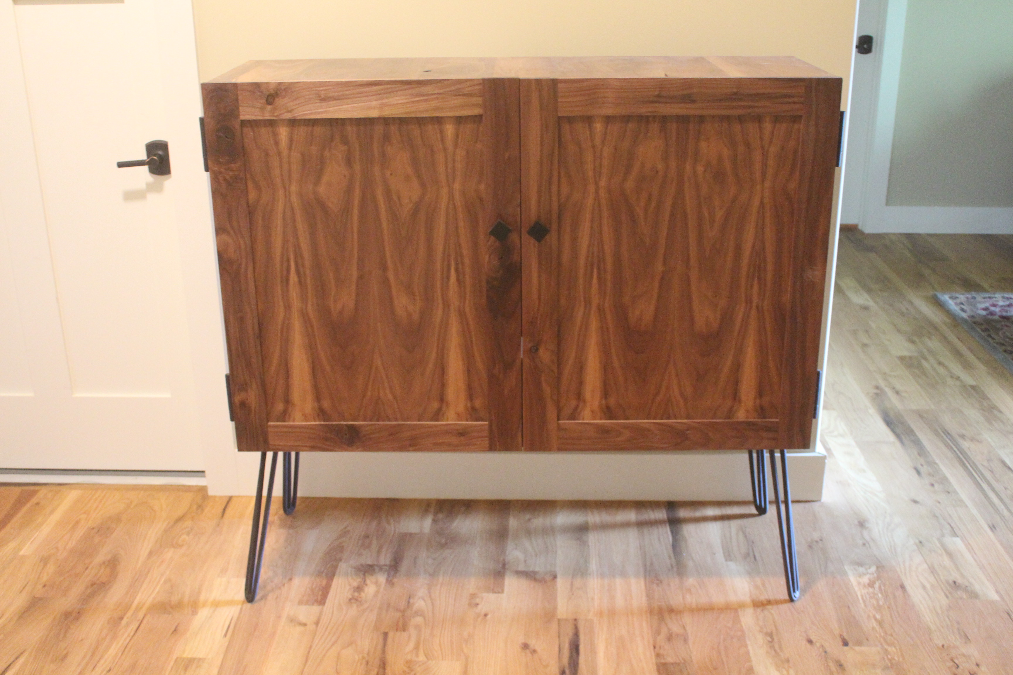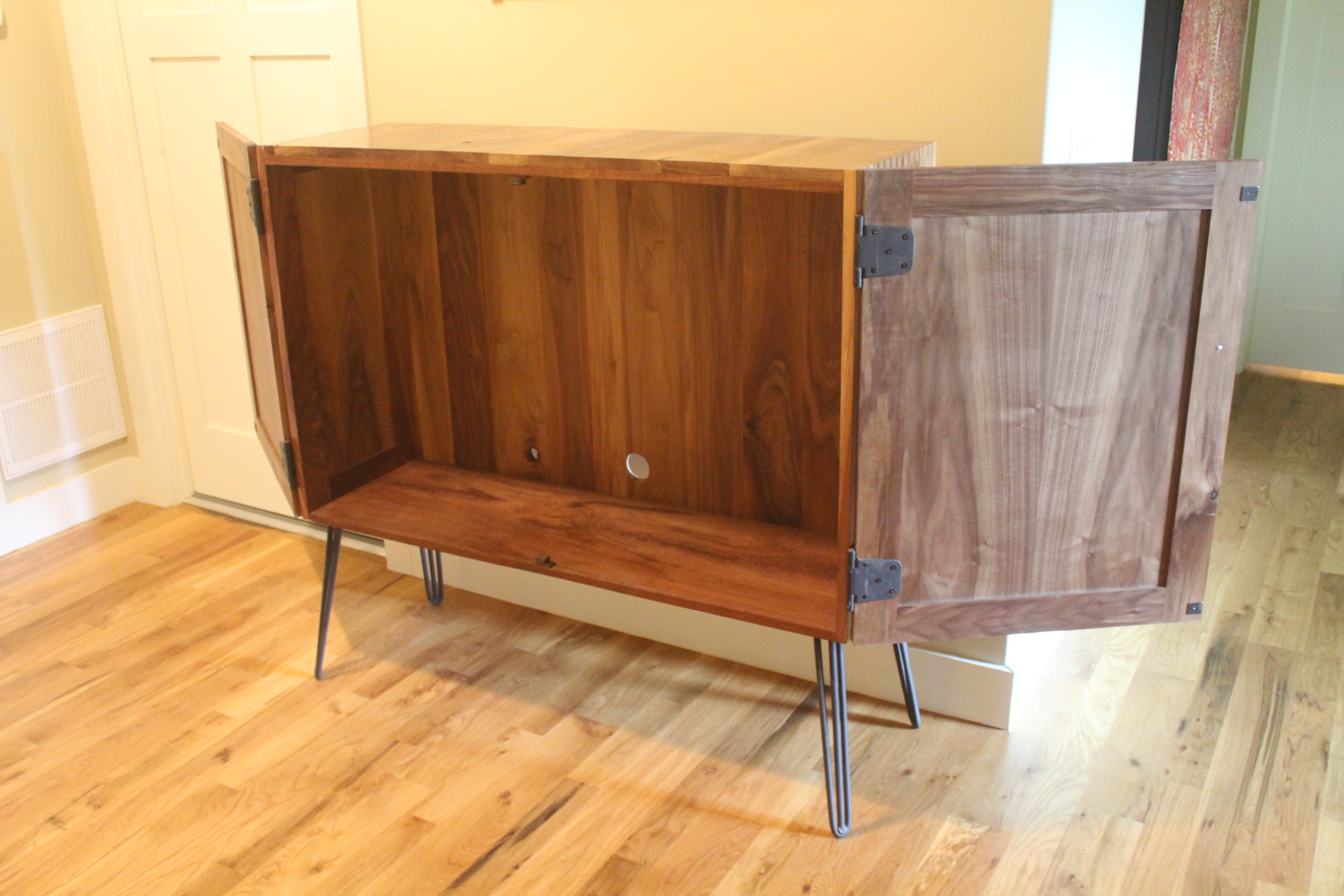 Black Walnut TV Cabinet on 3 Rod Hairpin Legs This cabinet stands 48″ high 50″ wide and 17″ deep. Made from black walnut. category Portfolio date August 21, 2017