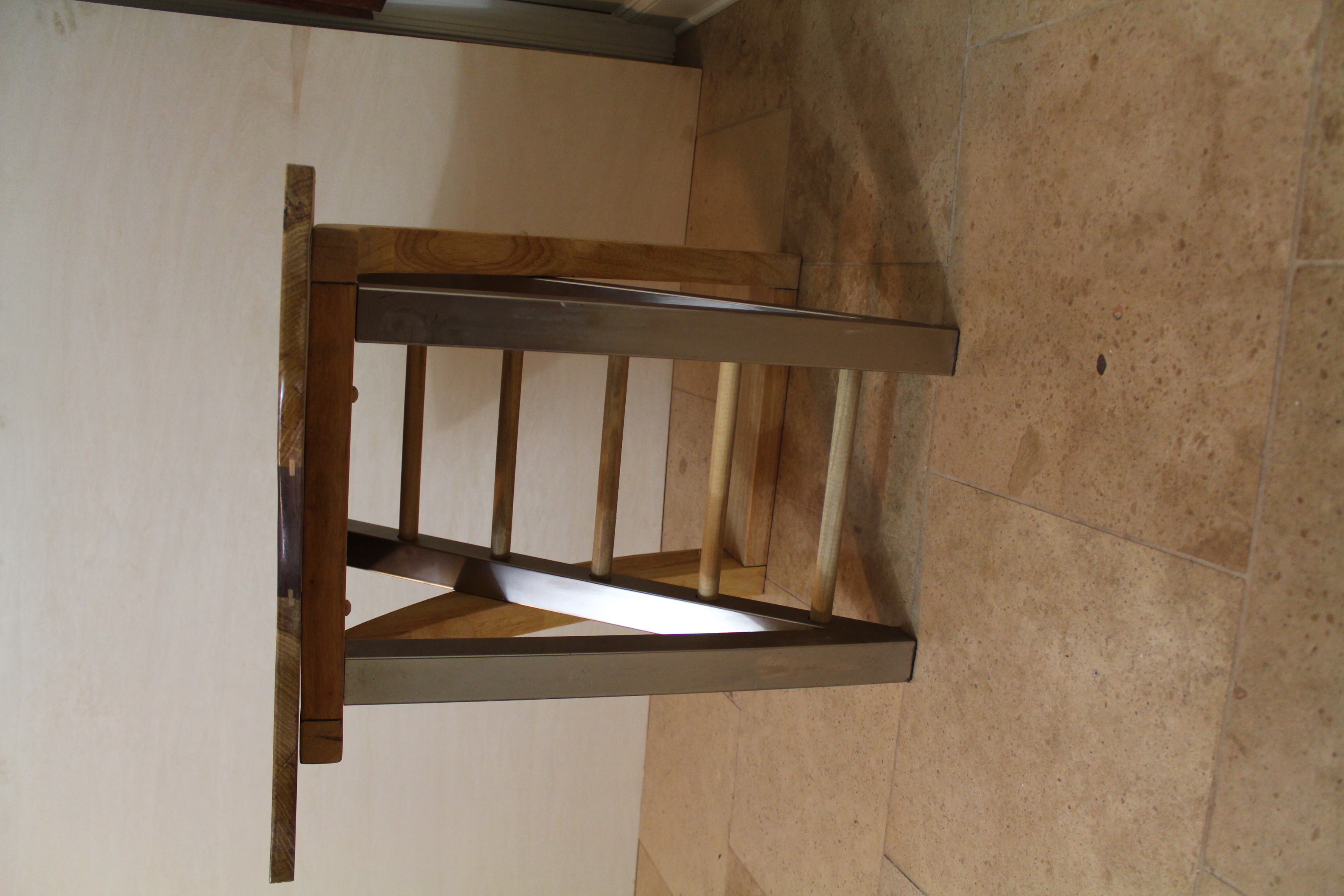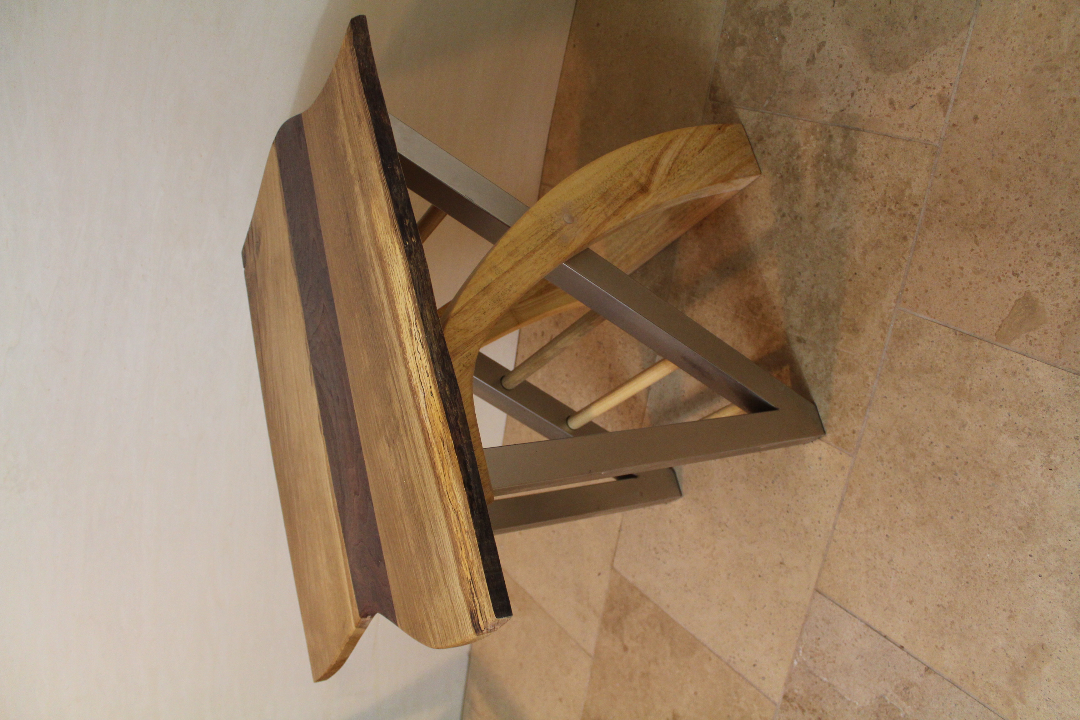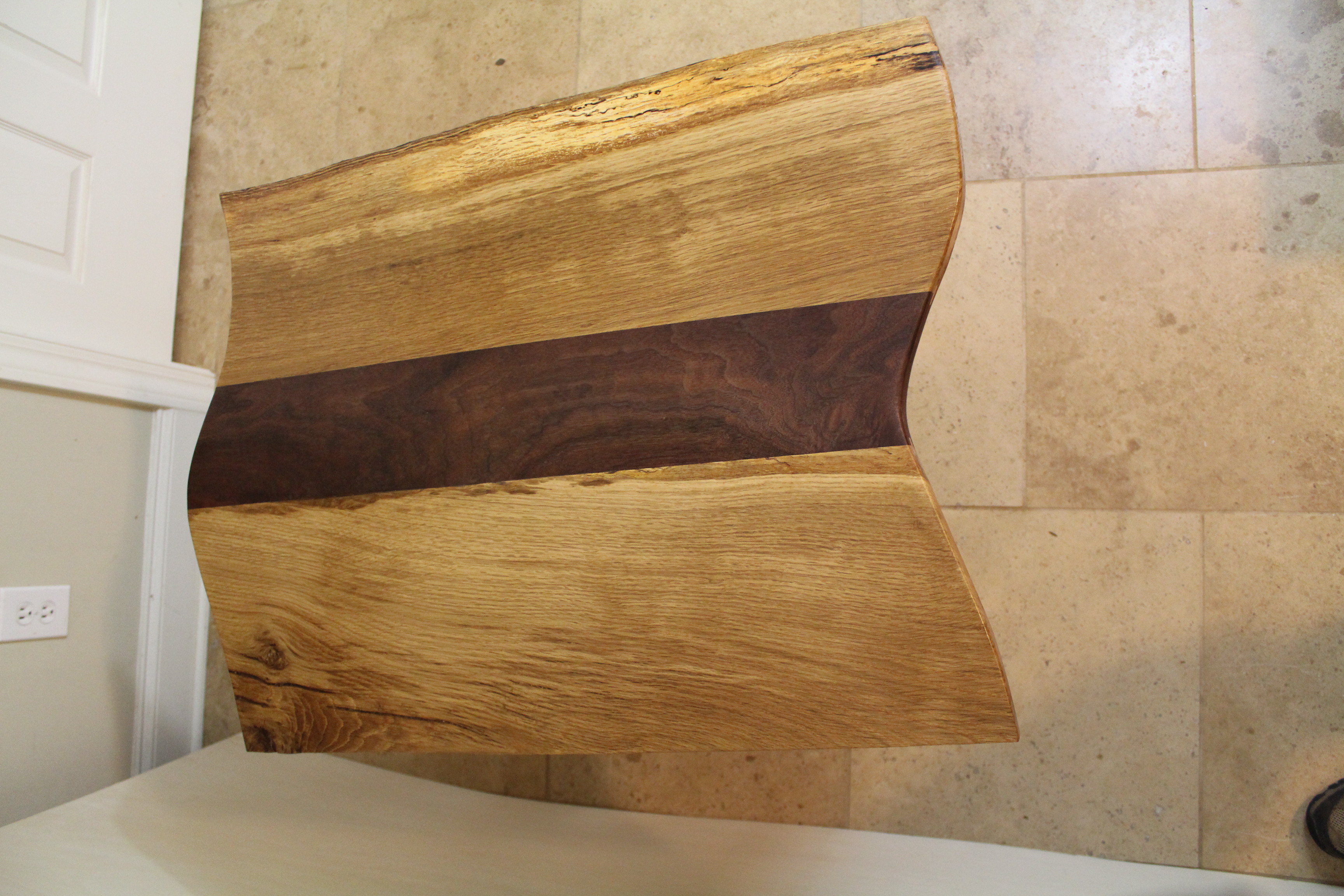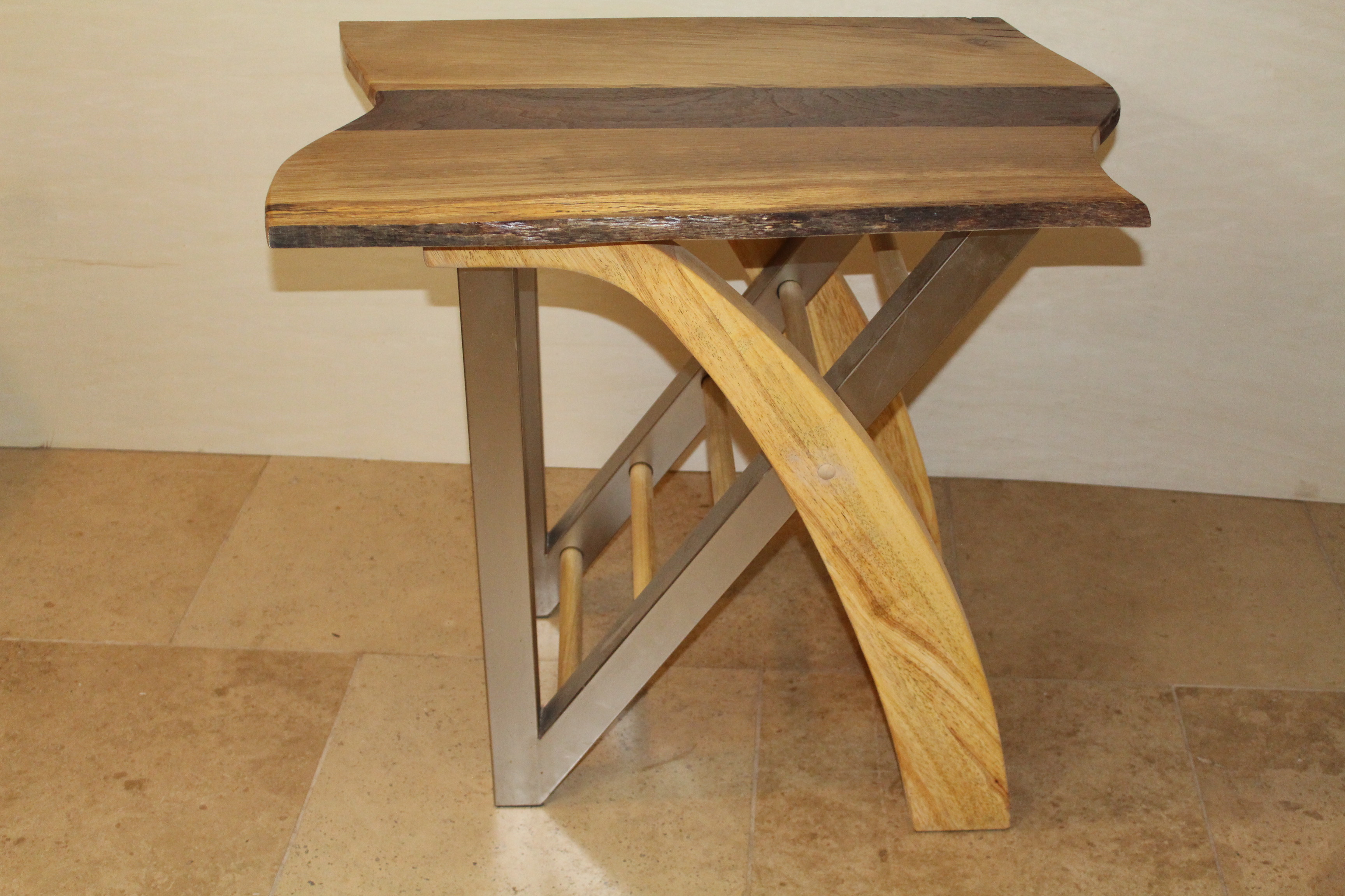 Modern Live Edge & Metal Side Table This side table is a fusion of natural live edge oak wood with black walnut and steel. It stands 27″ high and measures 23″ by 32″. category Portfolio date July 1, 2022