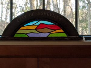 Sculpture: Stained Glass in City of Asheville manhole cover on black walnut base category Portfolio date November 29, 2021